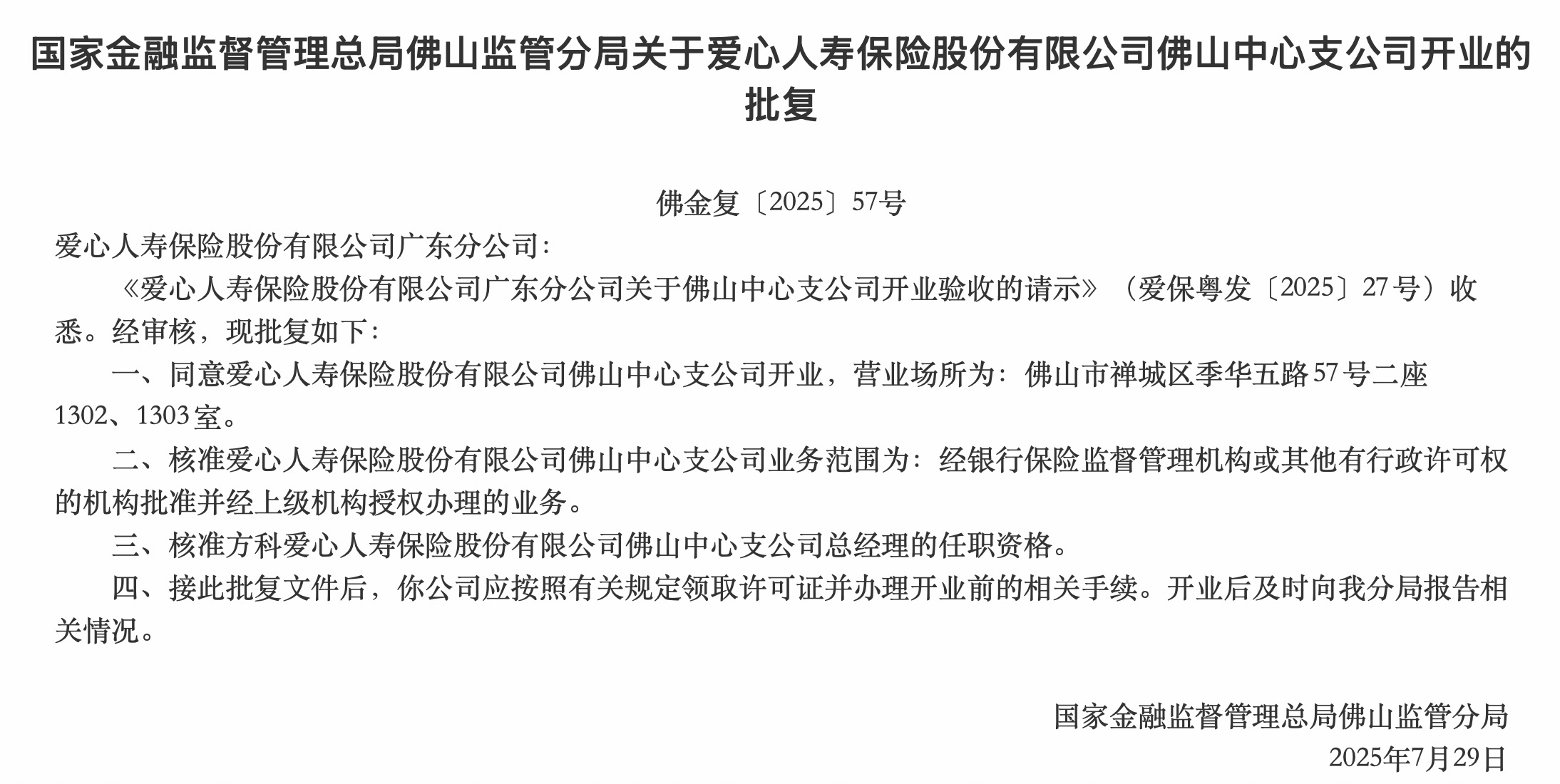 日前,南方+记者从国家金融监督管理总局广东监管局官网获悉,爱心人寿保险股份有限公司佛山中心支公司开业获批复,营业场所为佛山市禅城区季华五路57号(即万科金融中心)。